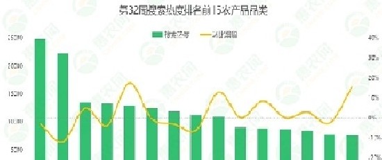 据惠农网平台对禽畜肉蛋、水产、蔬菜和水果4大农产品类目的重点监测与追踪,第32周,水产、蔬菜和水果排名前2位的品类与上周保持一致,禽畜肉蛋的排名有所调整:鸡苗热度超过活鸡位居榜首,活鸡紧随其后。