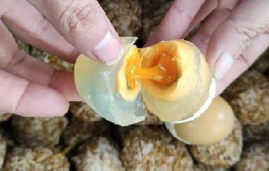 3、在阳光下或者灯光下透视,品质好的松花蛋内部呈深褐色或者黑色,只有小部分为黄色;品质差的松花蛋大部分呈黄色或浅红色,这说明松花蛋未成熟。