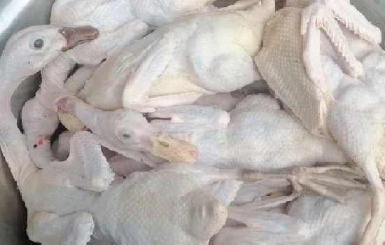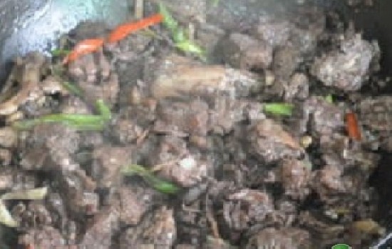 2、杀鸭时,先将鸭血流入醋加清水的酸水莱碗里,使其血浆不致凝固,然后将子姜、甜酱拌入血浆中搅匀,再将鸭子分档切成小块,用肥膘肉四至五两煎溶,将鸭放人铁锅中爆炒,再入辣椒、蒜拌炒闷熟,